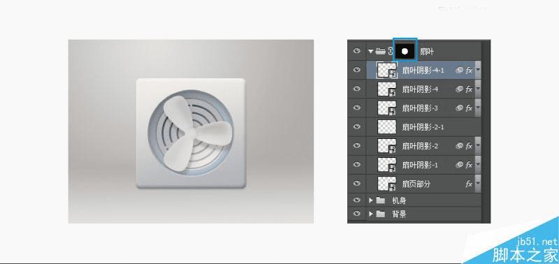 温馨提示:最后把整个扇叶部分的图层所有组成一个群组,并在该群组上面添加一个蒙版,盖掉下方多余的投影。
