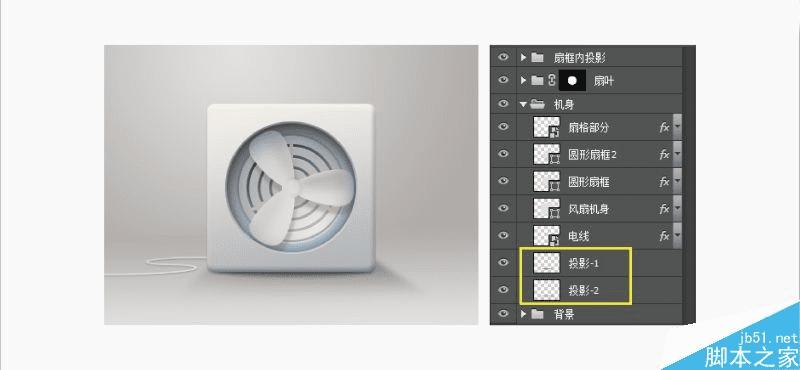 温馨提示:把机身部分的那个大的【圆形扇框】复制两层,图层填充改为0%,放到最顶层, 用来给扇框的内部加两层投影,丰富投影变化,增加空间感。