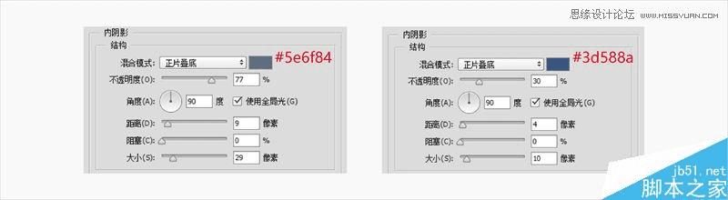图层样式:内阴影 模式:正片叠底 颜色:#3d588a 不透明度:30% 角度:90° 距离:4px 大小:10