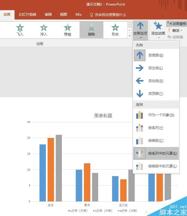 在PowerPoint中,点选粘贴过来的图表,然后切换到“动画”选项卡,选中“擦除”项,再点击“效果选项”,从下拉菜单中选择“按系列中的元素”,就会即时看到柱状图一条一条往上“涨”的动态效果了。