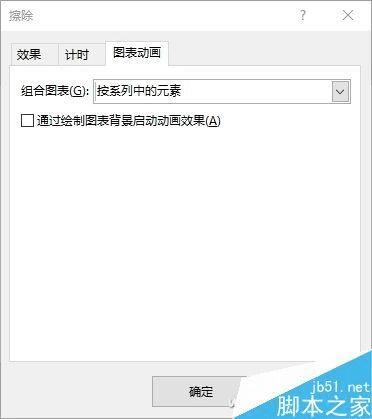 在打开的效果选项窗口中,可以设置伴随动画播放的音响效果,切换到“计时”选项卡中,可以设置每个柱形条的动态时长,最关键的是切换到“图表动画”选项卡中,将“通过绘制图表背景启动动画效果”项取消勾选,然后点击“确定”。