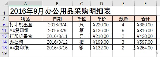 点击下拉箭头按钮,其中已自动提取出这一列中的数据选项了。如果我们只想看复印纸购买了多少,那么去除其他选项,只勾选复印纸这项。