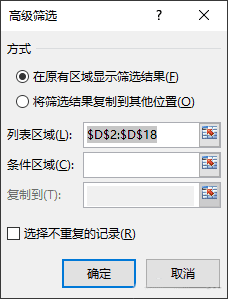 现在点击工具栏“排序与筛选”中的“高级”,将会打开高级筛选对话框,其中列表区域已自动填充。