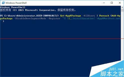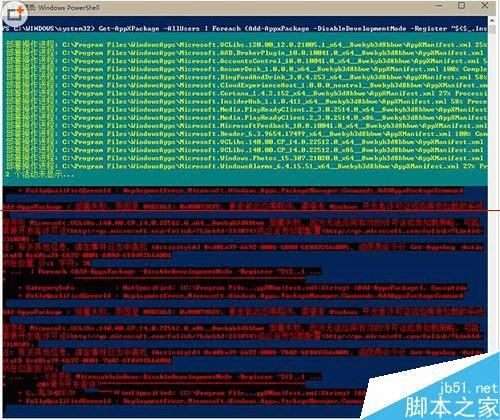 2、输入如下命令后回车:Get-AppXPackage -AllUsers | Foreach {Add-AppxPackage -DisableDevelopmentMode -Register “$($_.InstallLocation)\AppXManifest.xml”}