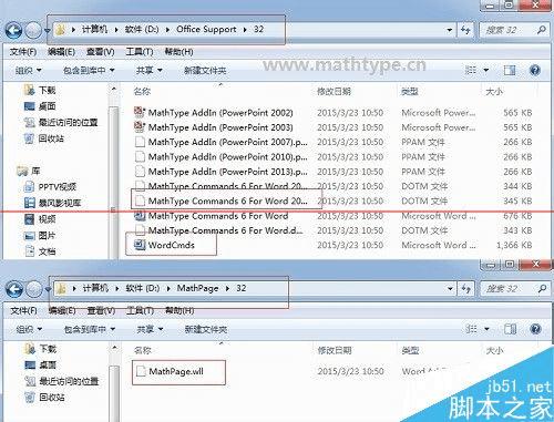 1、先卸载MathType再重新安装MathType,MathType会在相应office surpport目录下添加WordCmds.dot,MathType Commands 6 For Word.dot,MathPage目录下添加“32”文件夹中(或者“64”具体看自己电脑的安装情况)MathPage.will三个文件。
