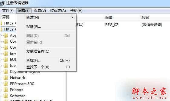2、点击开始——搜索,在搜索框中输入“regedit” 打开注册表管理器;