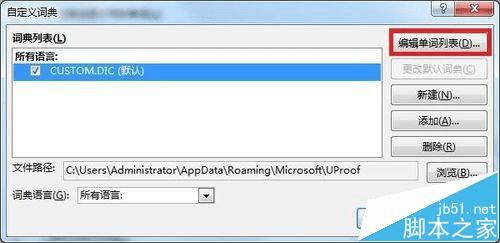 5、在自定义词典对话框中,点击右侧的“编辑单词列表”。