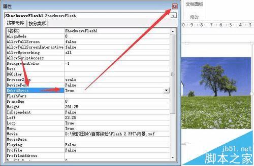 3)在属性对话框中找到“EmbedMovie”属性,在右边的属性值内选择“True”。(选择“Flase”就是不镶入)