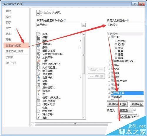2)点击“文件”——“选项”——“自定义功能区”——右边自定义功能区(B)选择“主选项卡”——找到“开发工具”,打钩——点击“确定”。