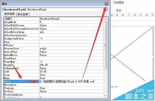 3)在属性对话框中找到“Movie”属性,在右边的属性值内填写刚才从Adobe Flash导出的swf格式图片绝对全路径和全文件名称。