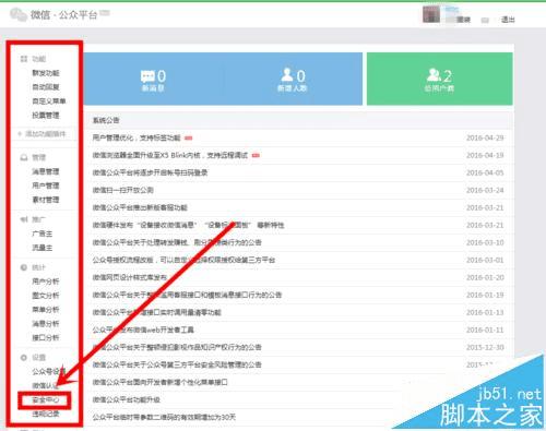 2、进入自己的公众号首页后,在“设置”选项中找到并点击“安全中心”;