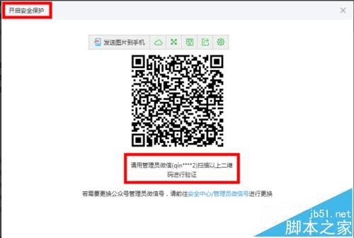 5、弹出“开启安全保护”,提示“请用管理员微信。。。扫描上二维码进行验证”;