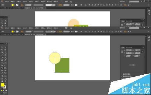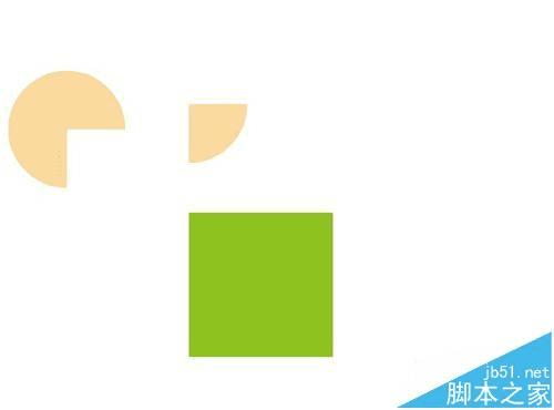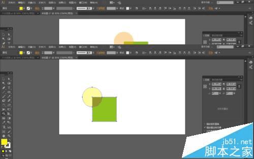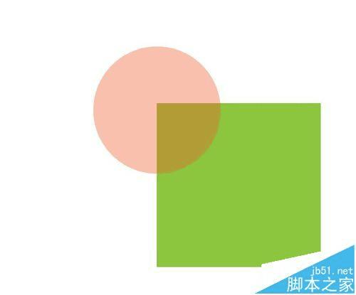 1、新建一个正方形和一个圆形,正方形透明度设为100%,CMYK值为(50,0,100,0),圆形透明度设为38%,CMYK值为(0,80,95,0),将圆形置于顶层,如下图所示摆放