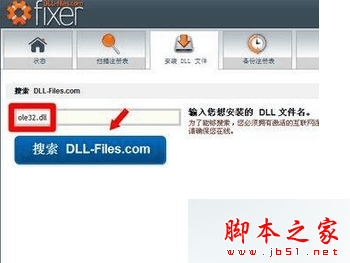 4、在注册过程中如果有遇到错误提示的,就说明动态链损坏导致的,我们可以下载“fixer”软件,在软件中搜索框中输入出错的“.dll”文件进行修复即可。
