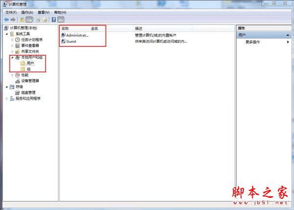 4、在打开的计算机管理窗口点击左侧的“本地用户和组”,在弹出的菜单中点击“用户”菜单项,右侧窗口就可以看到Administration账号了。