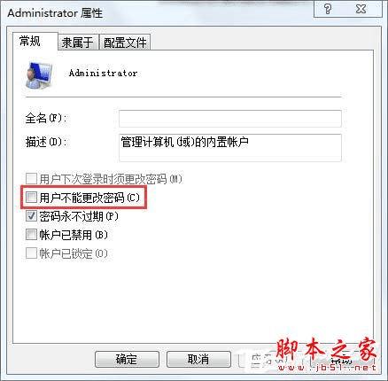 5、双击右侧的Administration账号,弹出属性窗口,在这里把“用户不能更改密码”前的复选去掉,最后点击确定按钮保存退出。这样就可以在账号管理中修改用户的密码了。