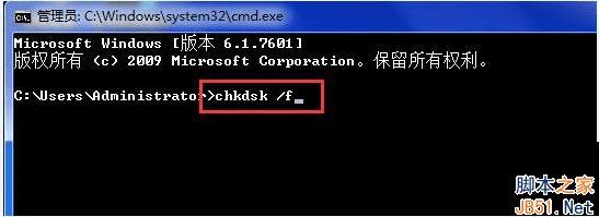 2、进入页面中,直接输入chkdsk /f (修复命令)按下回车。