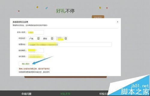 5、点击抽奖,一次,两次,最后一次,总有一次奖品在等着你,叮当,5元话费抽中了,窗口自动跳转到填写地址栏,仔细核对后,点击确认提交。等活动结束后(11月10日结束),届时会到账。记得查询哦。