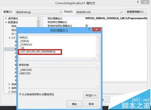 3、将“_CRT_SECURE_NO_WARNINGS”复制在以下红色框内,然后确定再单击应用即可。