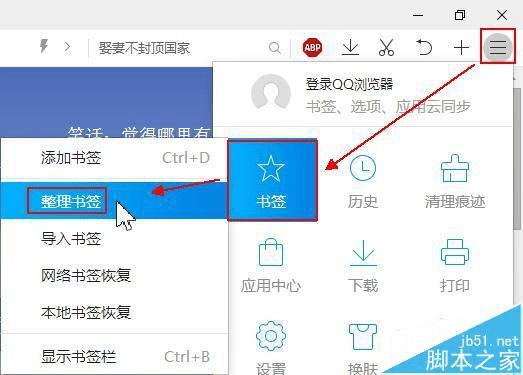 1、打开qq浏览器,右上角依次点击“三横线、书签、整理书签”