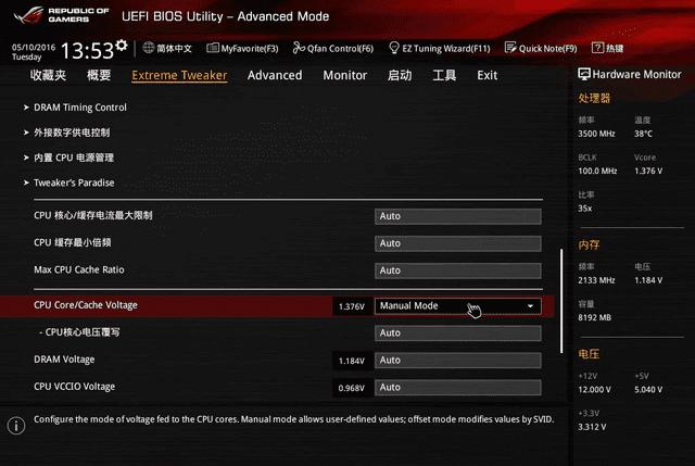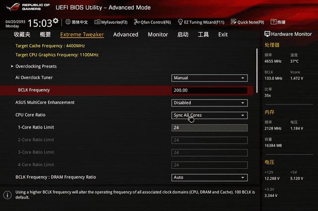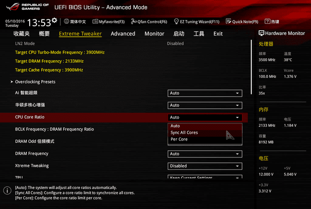 本次超频测试使用的是华硕MAXIMUSVIIIFORMULA主板,在进入BIOS界面之后,选择ExtremeTweaker菜单,即可看到丰富的超频选项。首先,让我们将CPUCoreRatio设置为SyncAllCores,这样处理器的每个核心都会运行在相同的频率下。然后将处理器的倍频锁定在45倍,这样处理器的每个核心的频率就都达到了4.5GHz。