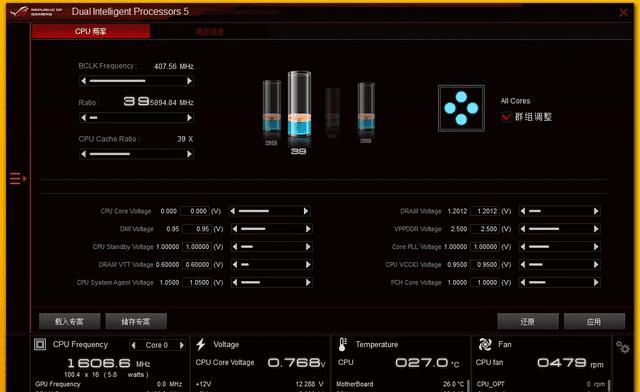 如果对BIOS界面的操作不够熟练,还可以通过安装华硕主板自带的AISuiteIII软件,通过软件当中集成的CPU超频功能来完成相应的超频操作。软件中的功能与BIOS中类似,同样提供了处理器倍频、外频、电压等一系列参数供用户调节,同时还可以实时显示出平台当前的运行状态。