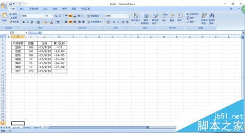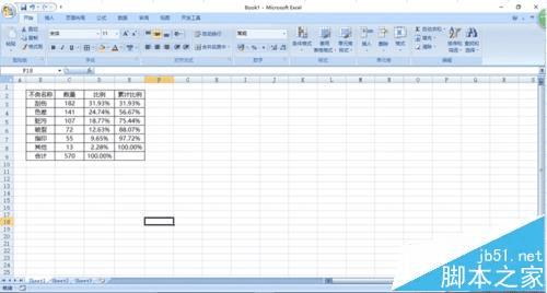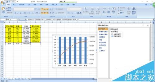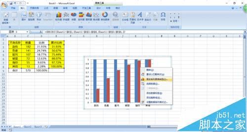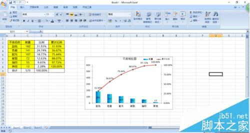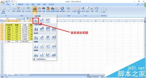 3、按ctrl选择图中黄色区域(不良名称、数量、累计比例,注意合计那一行不要选),插入→柱形图,选择二维柱形图中的簇状柱形图。