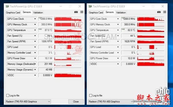 频率方面,两块RX 480的最高频率都达到了1288MHz,主卡最高温度87度,副卡最高82度。