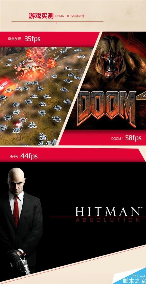 游戏方面,在1080p全特效模式下,《奇点灰烬》可达35fps、《毁灭战士4》可达58fps,《杀手6》则能够达到44fps。