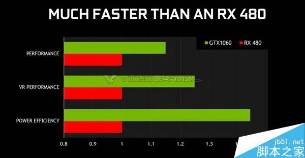 官方宣称,GTX 1060要让每一位玩家都享受到GTX 980档次的能力,同时其性能要比RX 480高出大约15%,VR虚拟现实性能高出大约25%,而凭借更低的功耗,能效高出多达45%!