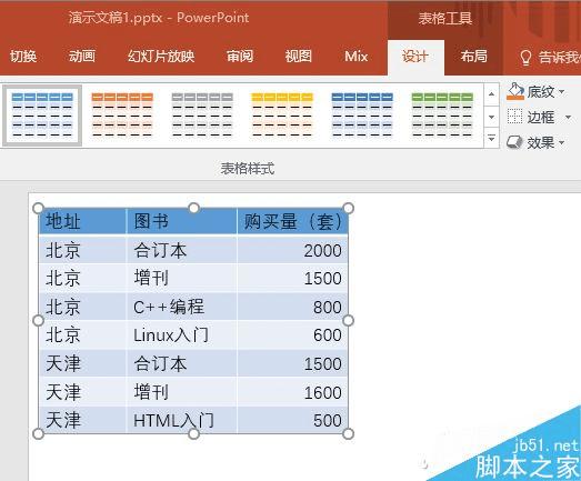 首先在PowerPoint中制作好表格,并切换到“表格工具-设计”选项卡中。