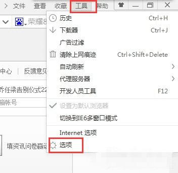 1、打开360浏览器,鼠标移到浏览器右上角,打开工具——选项;