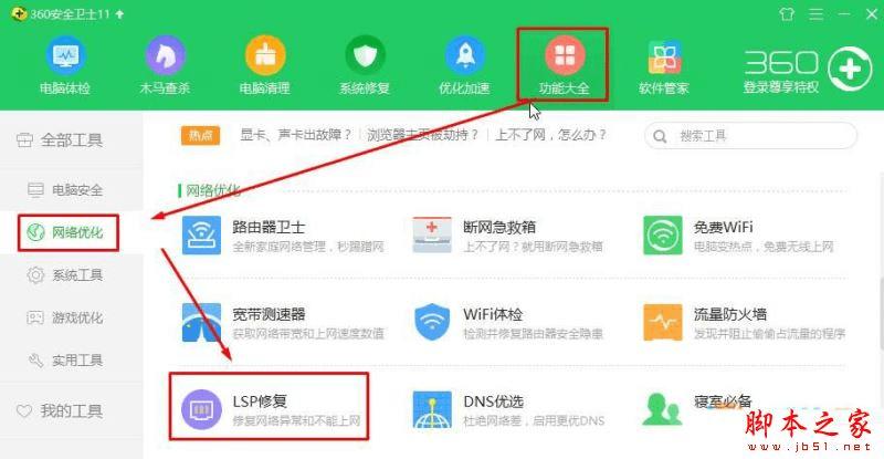 1、打开360的功能大全,切换到【网络优化】一栏中,点击【LSP修复】;