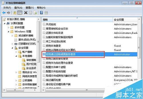 4、在“用户权限分配”视图中,寻找“拒绝通过远程桌面服务登录”,然后双击打开它。
