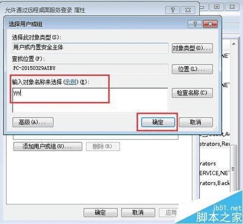 8、比如在这里我们添加一个yyy的用户账号(注意yyy账号本身是存在的),点击“确定”按钮。