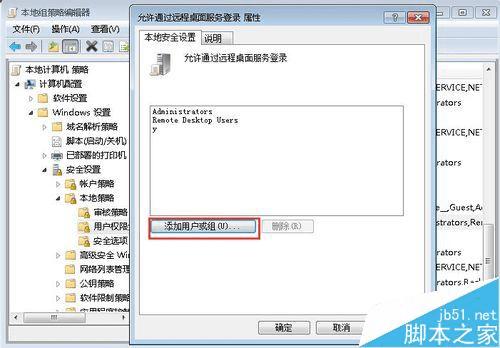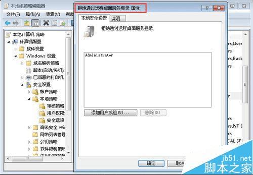 5、在“拒绝通过远程桌面服务登录”属性窗口中,查看有无RemoteDesktopUsers和需要登录的域用户帐号,如有请删除。