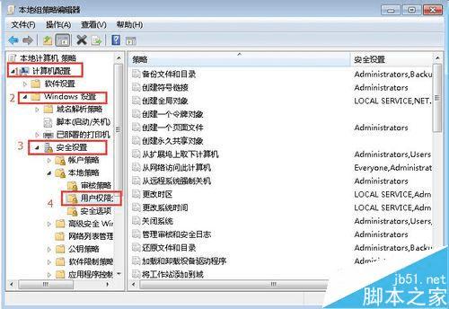 3、在“本地组策略编辑器”中点击“计算机配置”-->“Windows设置”-->“安全设置”-->“用户权限分配”。