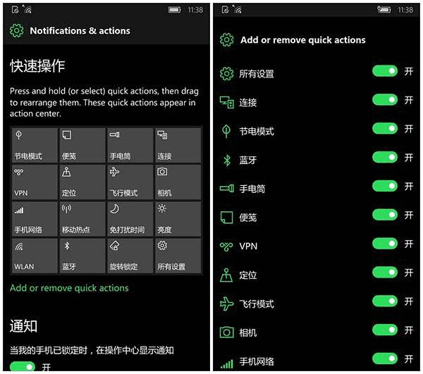 小编发现升级到Windows 10 Mobile Build 14328之后,发现之前版本中设置显示英文问题已经修正,大部分都恢复到中文显示。另外通知中心操作之前版本中会出现快捷操作按钮永久消失问题也已得到修正。