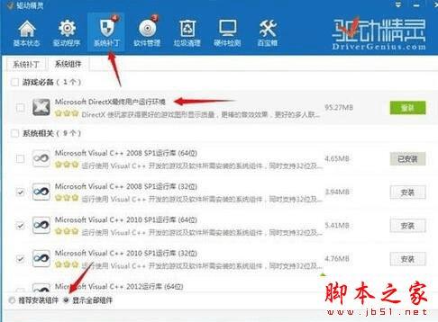 2、在驱动精灵的“系统补丁”模块下安装“Microsoft DirectX最终用户运行环境”(即使显示“已安装”也要重装一遍)并根据提示重启计算机,如下图所示: