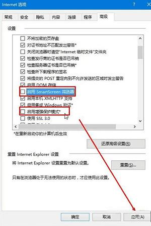 2、切换到【高级】选项卡,将下面的“启用SmartScreen筛选器”和“启用增强保护模式” 的勾去掉,点击【应用】并确定;