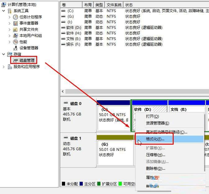 4、在左侧点击【磁盘管理】,在右侧找到磁盘D,单击右键,选择“格式化”;