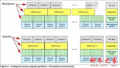 这张图演示了在虚拟化环境下对齐和非对齐分区的情况。当“Aligned”对齐时,在Hypervisor层VMFS-5的文件块大小统一为1MB,子块(Sub-Blocks)大小8KB正好对应2个物理扇区上的16个逻辑扇区。此时如果虚拟机的OS block正好与VMFS子块对齐的话,等于就是与物理磁盘扇区对齐了,这样还算好一些的情况。