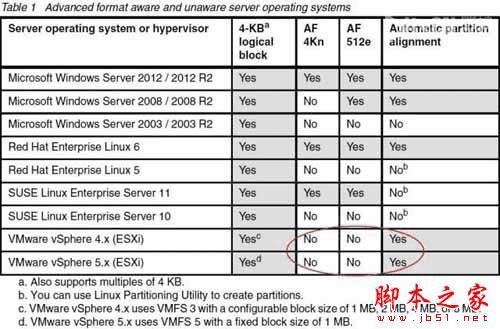 我们参考下这个表格里不同操作系统对高级格式化的感知情况。其中,Windows从Server 2008开始能够感知512e硬盘并自动对齐分区;Server 2012进一步加入了对原生4Kn设备的支持。RHEL 6可以感知512e和4Kn硬盘并能自动对齐;SLES 11能感知512e和4Kn硬盘却无法自动对齐?VMware ESXi 4.x和5.x都无法感知512e和4Kn硬盘,但支持自动分区对齐。这里有必要进一步解释下。
