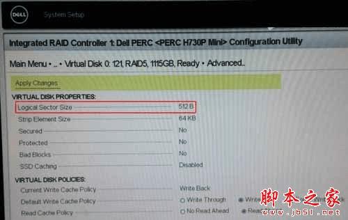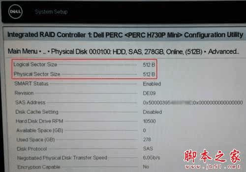 如上图,这台戴尔服务器配置了PERC 9系列RAID卡中的H730P Mini,它识别到当前选定SAS硬盘的物理和逻辑扇区大小都是512Byte。