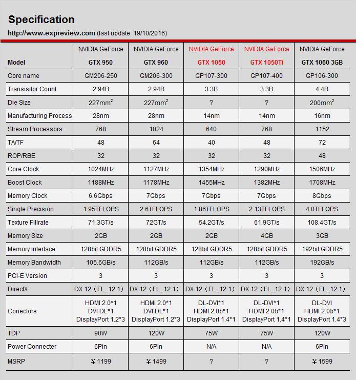 GTX 1050和GTX 1050 Ti目前已知的参数对比整理如下图。