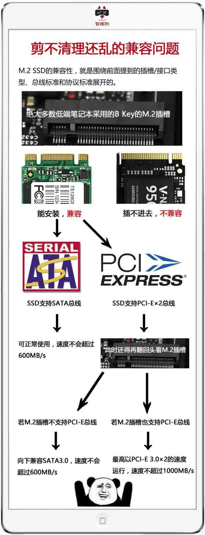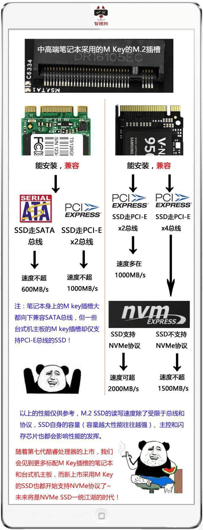 看到这里可能很多童鞋已经泛起了迷糊:啥叫PCI-E 3.0×4(标准名称为PCIExpress Gen 3×4)?NVMe又是什么?M.2接口不是SATA总线吗?所以接下来,我们就通过5张图片,全面了解一下和M.2相关的这些参数吧。