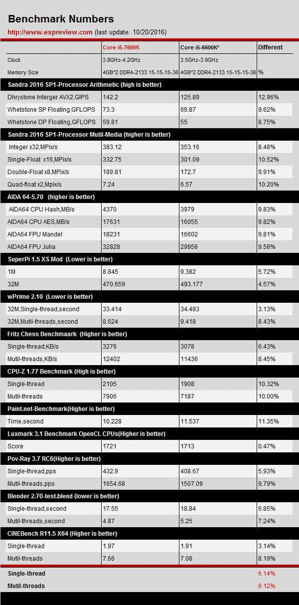 与Core i5-6600K相比,Core i5-7600K多线程领先9%,单线程领先6%,这是在频率与架构优化共同作用的情况下达成的。