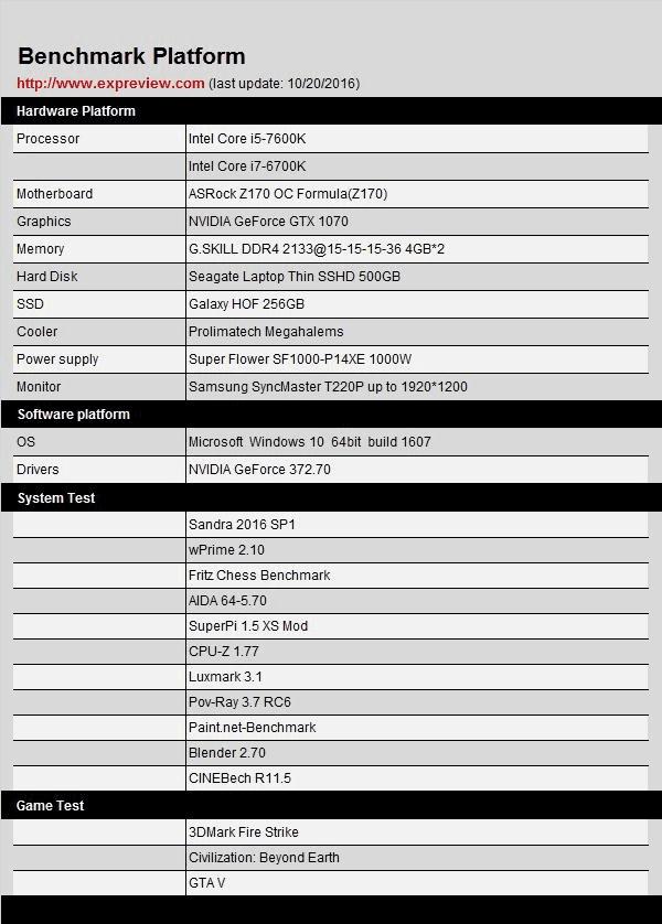 显卡采用GTX 1070 FE版,系统使用Windows 10build 1607,显卡驱动是NVIDIA GeForce 372.70,测试项目包括CPU基础性能测试与游戏性能测试。这次我们只测试CPU的性能,核显性能虽然我们也很想知道但是目前没有驱动根本没法测,功耗方面这块Core i5-7600K是ES来的,根据以往经验ES版处理器的电压都偏高,所以功耗测试还是等到正式版来后再做吧。