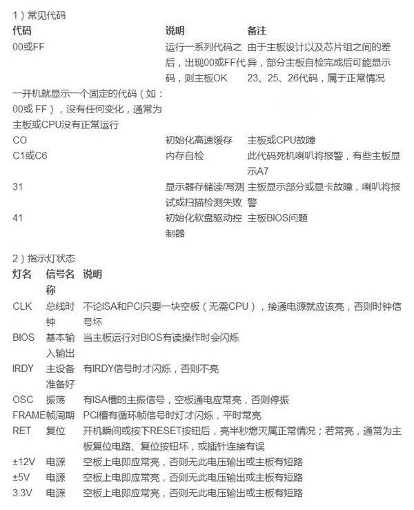 总的来说,主板诊断卡使用非常简单,复杂的是代汉含义的理解,以下是主板诊断卡代码与指示灯状态见诊断卡说明书。
