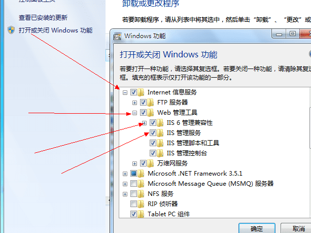 找到Internet信息服务, 打开,找到iis管理服务,可以把iis有关的直接全选了,点击确定等待完成。——更正一下,iis6没必要选,这里用不到,只打开iss服务就满足需求了。